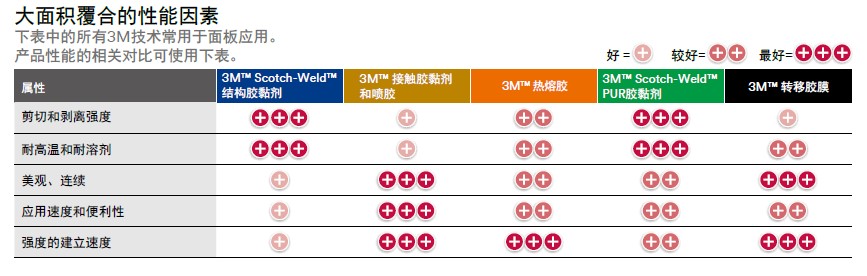 大面積覆合的性能因素,下表中的所有3M技術常用于面板應用。產品性能的相關對比可使用下表。
